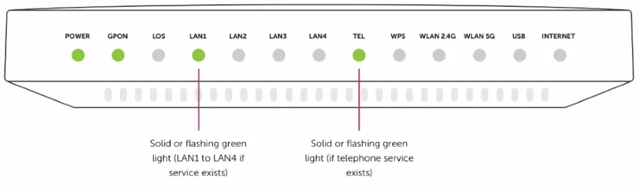 While types of ONTs can differ with age and area of the country, in general the lights on your ONT should be as below: