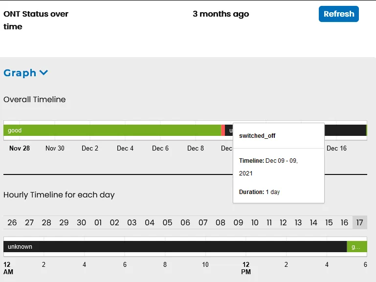 Within the interface, you can view an overall timeline, and also select a day of the month to view an hourly timeline/breakdown of ONT statuses.