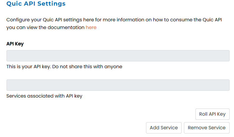 Within a service in your Quic customer account, you will be able to see a section about Quic API Settings, as below: